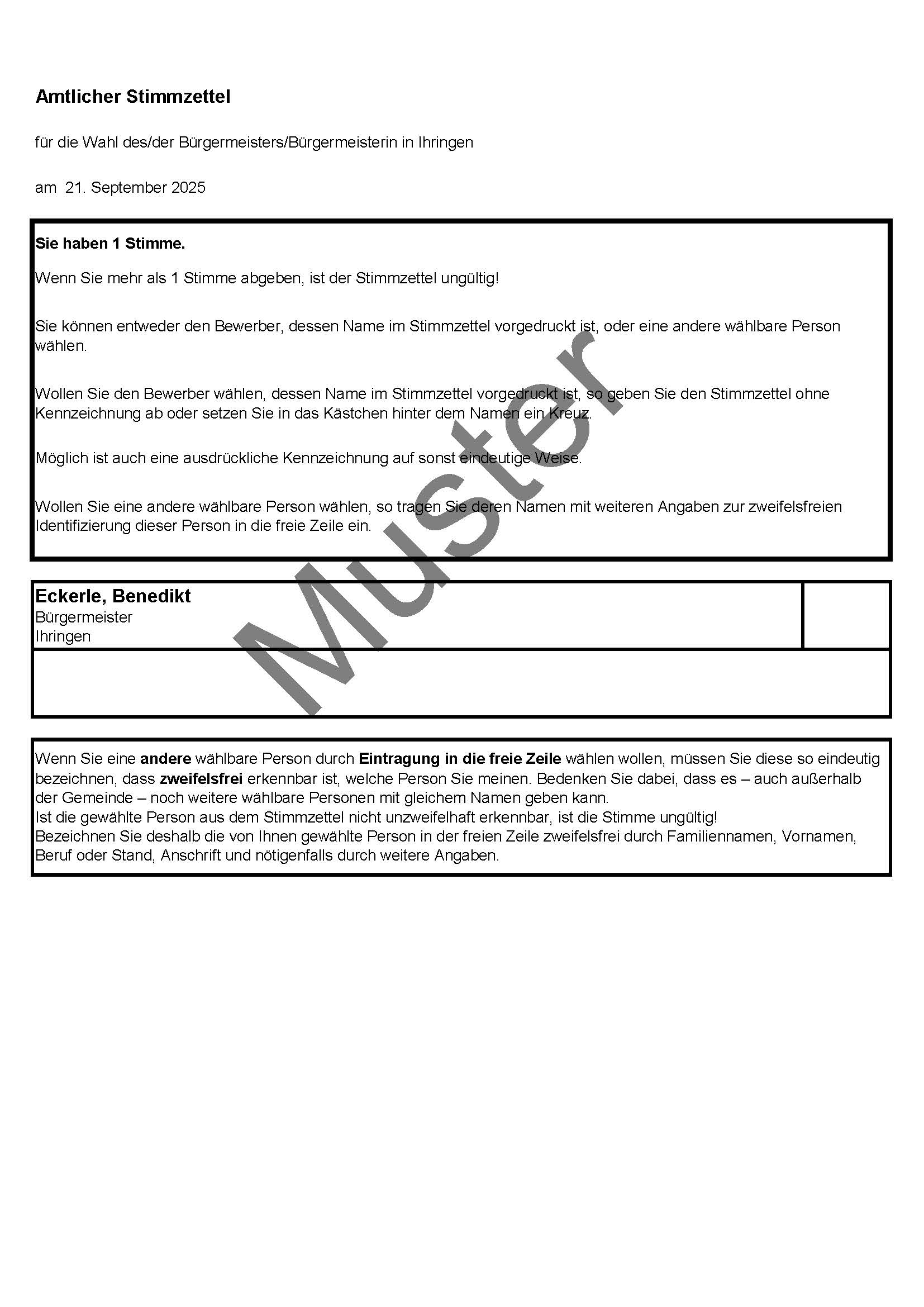 Der Gemeindewahlausschuss hat in seiner Sitzung am 01.09.2025 die einzige, eingegangene Bewerbung von Herrn Benedikt Eckerle geprüft und zugelassen. Somit wird Herr Benedikt Eckerle als einziger Bewerber auf dem Stimmzettel aufgeführt.