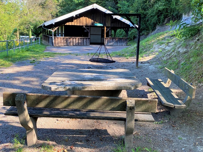 Im Außenbereich der Hütte befindet sich eine Feuerstelle mit Schwenkgrill und 2 Bänken sowie einem Tischen.