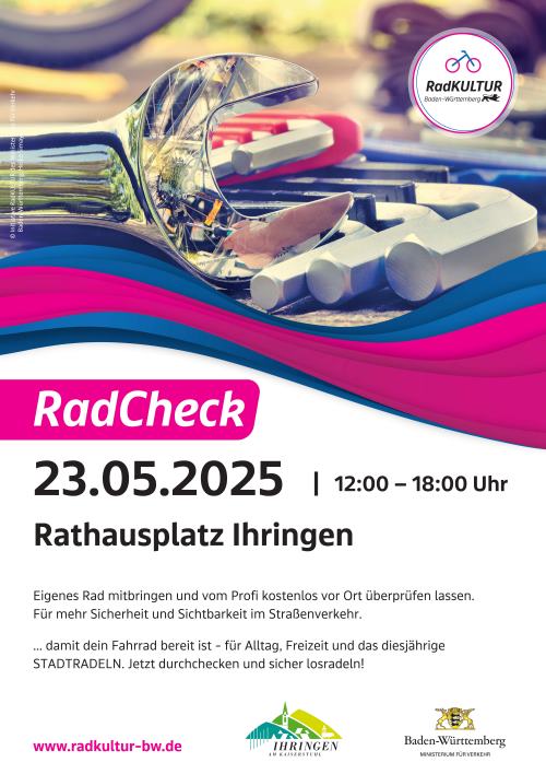 Am Freitag, den 23. Mai 2025 kommt der RadCheck nach Ihringen und macht auf dem Rathausplatz Station: Von 12 bis 18 Uhr sind alle Ihringer Bürgerinnen und Bürger herzlich eingeladen, ihr Fahrrad kostenlos von fachkundigen Mechanikern auf Verkehrstauglichkeit überprüfen zu lassen.