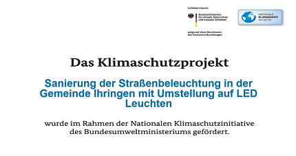 Der Klimaschutz ist in aller Munde. Auch die Gemeinde Ihringen hat sich im Dezember 2016 mit einer „Unterstützenden Erklärung nach § 7 Abs. 4 Klimaschutzgesetz“ dem Klimaschutzpakt zwischen dem Land Baden-Württemberg und den kommunalen Landesverbänden angeschlossen. Damit möchte die Gemeinde vor Ort einen aktiven Beitrag zum Klimaschutz leisten. Hierfür hat die Gemeinde Ihringen z.B. im Jahr 2018 einen beträchtlichen Betrag in die Hand genommen, um das wichtigste Ziel des Klimaschutzes, die Treibhausgasemission zu senken, auch vor Ort zu unterstützen. In der Zeit vom 01.02.2018 bis 18.12.2018 wurde die gesamte Straßenbeleuchtung in Ihringen und Wasenweiler auf LED-Beleuchtung umgestellt. Diese für die Gemeinde bedeutende Klimaschutzmaßnahme trägt dazu bei, in den nächsten 20 Jahren rund 2.365 t CO2-Emissionen einzusparen. Die Stromeinsparungen werden voraussichtlich rund 200.000 kw/h pro Jahr betragen. Diese Maßnahme wurde dankenswerterweise über das Klimaschutzprogramm des Projektträgers Jülich (PtJ) gefördert. Im Auftrag des „Bundesministerium für Umwelt, Naturschutz und nukleare Sicherheit “ wurden im Rahmen der „Nationalen Klimaschutzinitiative“ rund 20 % der Kosten übernommen.
