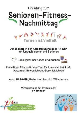 Alle Interessierte ab 60 Jahren aus Ihringen und Umgebung sind herzlich zum Alltags-Fitness-Test in die Kaiserstuhlhalle eingeladen. In Testübungen werden Kraft, Ausdauer, Beweglichkeit und die Geschicklichkeit in Testübungen überprüft. Im Anschluss kann man den Nachmittag bei Kaffee und Kuchen ausklingen lassen.