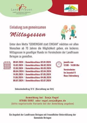 Unter dem Motto "Gemeinsam statt Einsam" möchten wir allen Menschen ab 70 Jahren die Möglichkeit geben, ein leckeres Mittagessen in geselliger Runde im Vereinsheim der Landfrauen Ihringen zu genießen.