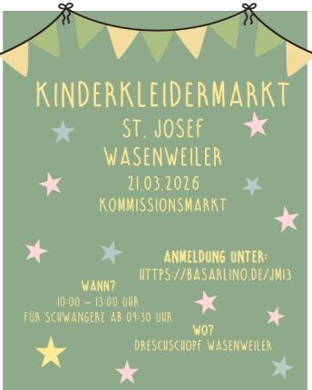Der Kinderkleidermarkt St. Josef im Dreschschopf Wasenweiler findet von 10 bis 13 Uhr statt. Für Schwangere hat der Kleidermarkt bereits ab 09.30 Uhr geöffnet.