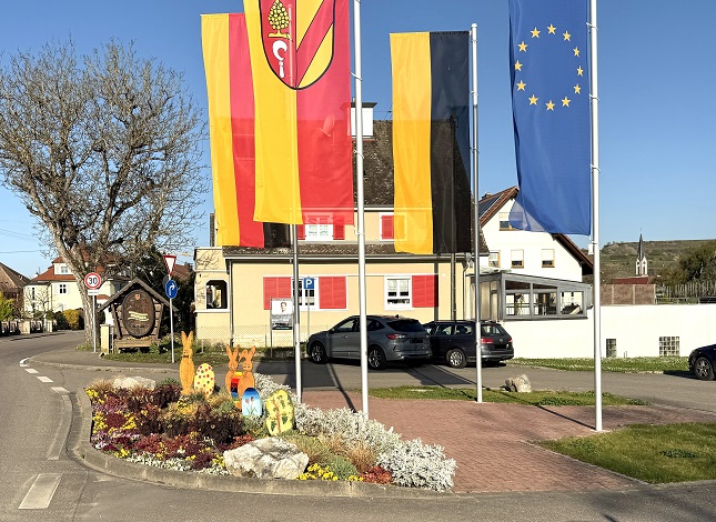 Die Verkehrsinsel am Ortsausgang Richtung Wasenweiler wurde nun mit bunten Dekorationen verschönert.